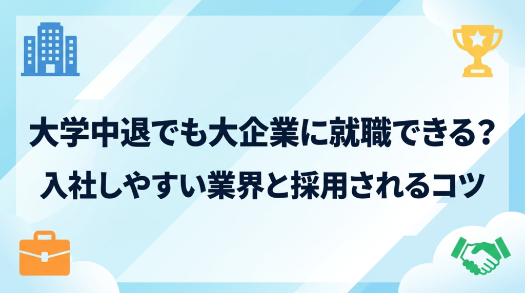「大学中退したら、もう大企業には入れないのでは?」と不安を感じていませんか?周りが就活で大手企業の内定を決めていく中、中退した自分には縁のない世界だと諦めかけている方も多いのではないでしょうか。 しかし実は、大企業の求人の約4割が「学歴不... -