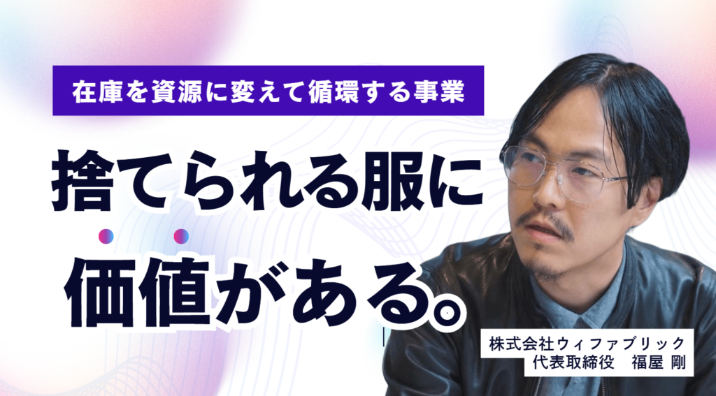 大量に生産され、まだ着られるのに捨てられていく服たち。 前職の商社でその業界課題を痛感した、株式会社ウィファブリック・福屋社長は、そこに“新しい価値”を見いだしました。 「捨てられるはずの在庫を、必要とする人に届けたい。」 この気づきから生ま... -