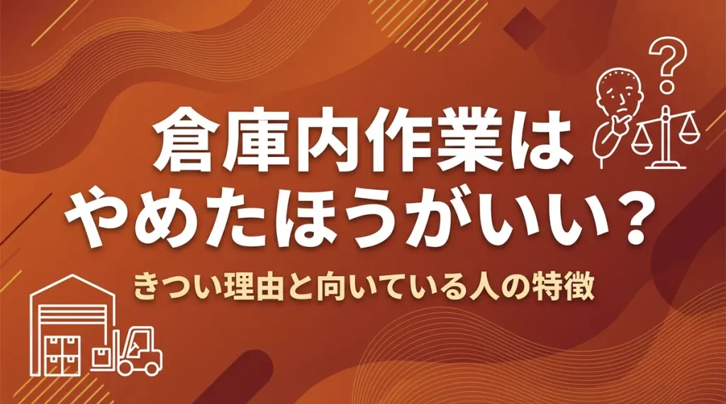 「倉庫内作業はやめたほうがいい」。そんな声を聞いて不安になっているなら、それは自分のキャリアに真剣に向き合っている証拠です。倉庫内作業にはきつい面もありますが、向いている人にとっては安定して働きやすい仕事でもあります。この記事では、倉庫... -