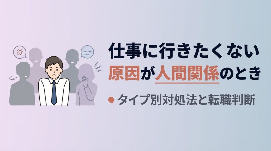 職場の人間関係が原因で仕事に行きたくない方へ。上司・同僚・部下・取引先のタイプ別対処法、パワハラ・モラハラへの法的対処、転職判断の軸を寄り添って解説します。 -