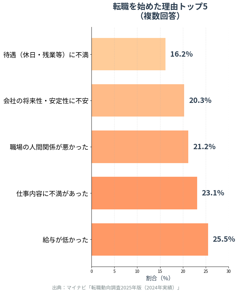 マイナビの「転職動向調査2025年版(2024年実績)」によると、転職活動を始めた理由として「職場の人間関係が悪かった」を挙げた人は21.2%にのぼります。また、厚生労働省の「令和2年転職者実態調査」では、自己都合による離職理由として「労働条件(賃金以外)がよくなかった」が28.2%と最も高く、「人間関係がうまくいかなかった」も23.0%と上位に入っています。多くの人が、仕事内容そのものよりも、働く環境や対人関係に限界を感じて「逃げ」を選択しているのです。
