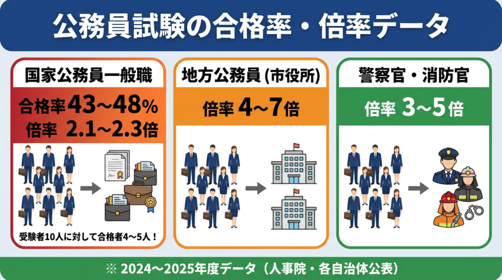 公務員試験と一口に言っても、職種や自治体によって難易度は大きく異なります。主な試験の合格率を見てみましょう。