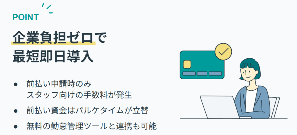 はい、その理解で大丈夫です。スタッフ様が「今月ちょっと早めに受け取りたい」というときに、導入企業ではなく、当社がいったん立て替えてお振り込みします。スタッフ様には、手数料として前払い金額の4.8%と振込手数料160円をご負担いただく形です。