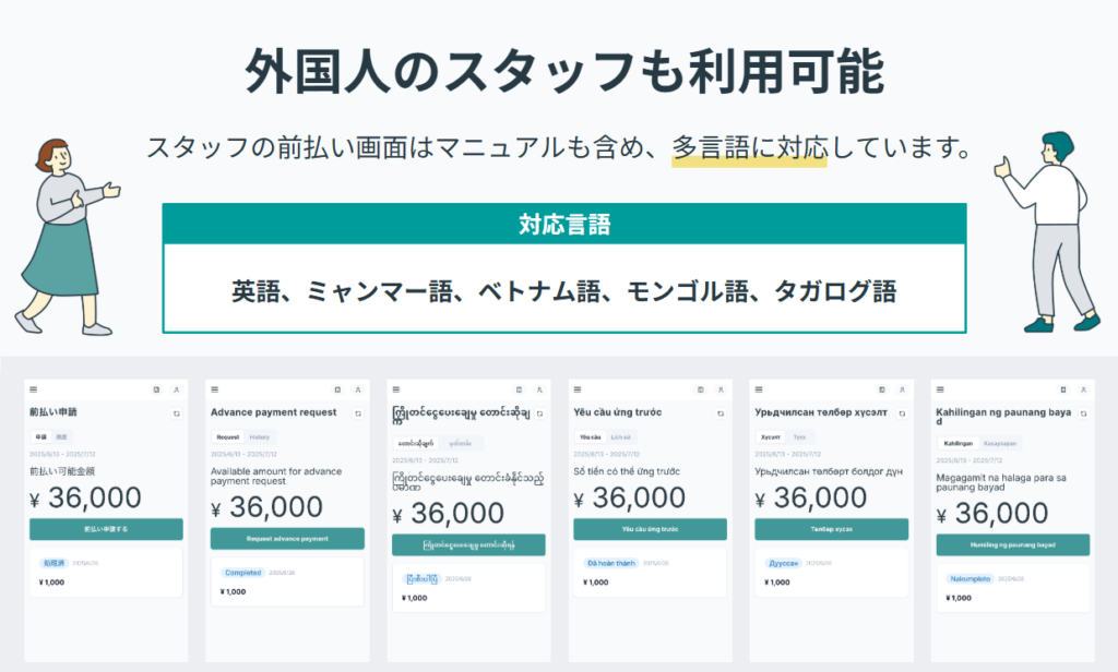正社員の方は前払いの仕組みに触れない方が多いと思いますが、現場ワークをされている企業様ではニーズが高いです。「前払いができる」というだけで、採用のきっかけや職場定着の後押しになることもあります。