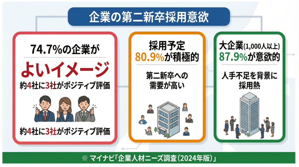マイナビの「企業人材ニーズ調査2024年版」によると、第二新卒人材に対して74.7%の企業がよいイメージを持ち、今後の採用予定について80.9%が積極的な姿勢を見せています。特に従業員1,000人以上の企業では87.9%が第二新卒採用に意欲的です。