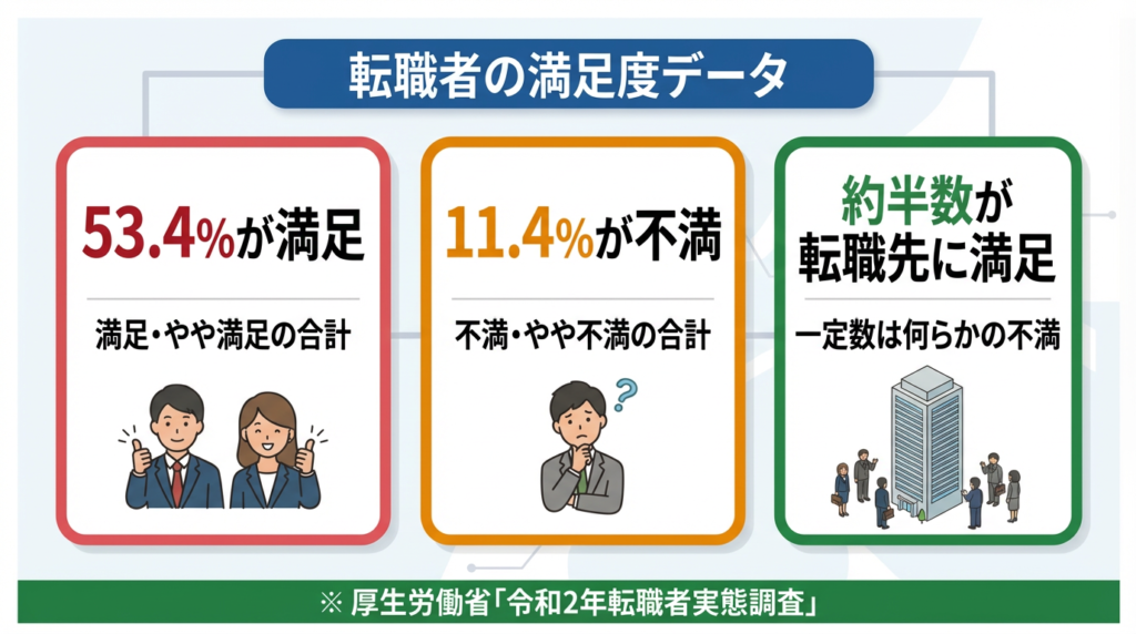 また、厚生労働省「令和2年転職者実態調査」によると、転職者の現在の勤務先における満足度は53.4%(「満足」「やや満足」の合計)となっています。一方で「不満」「やや不満」の合計は11.4%です。